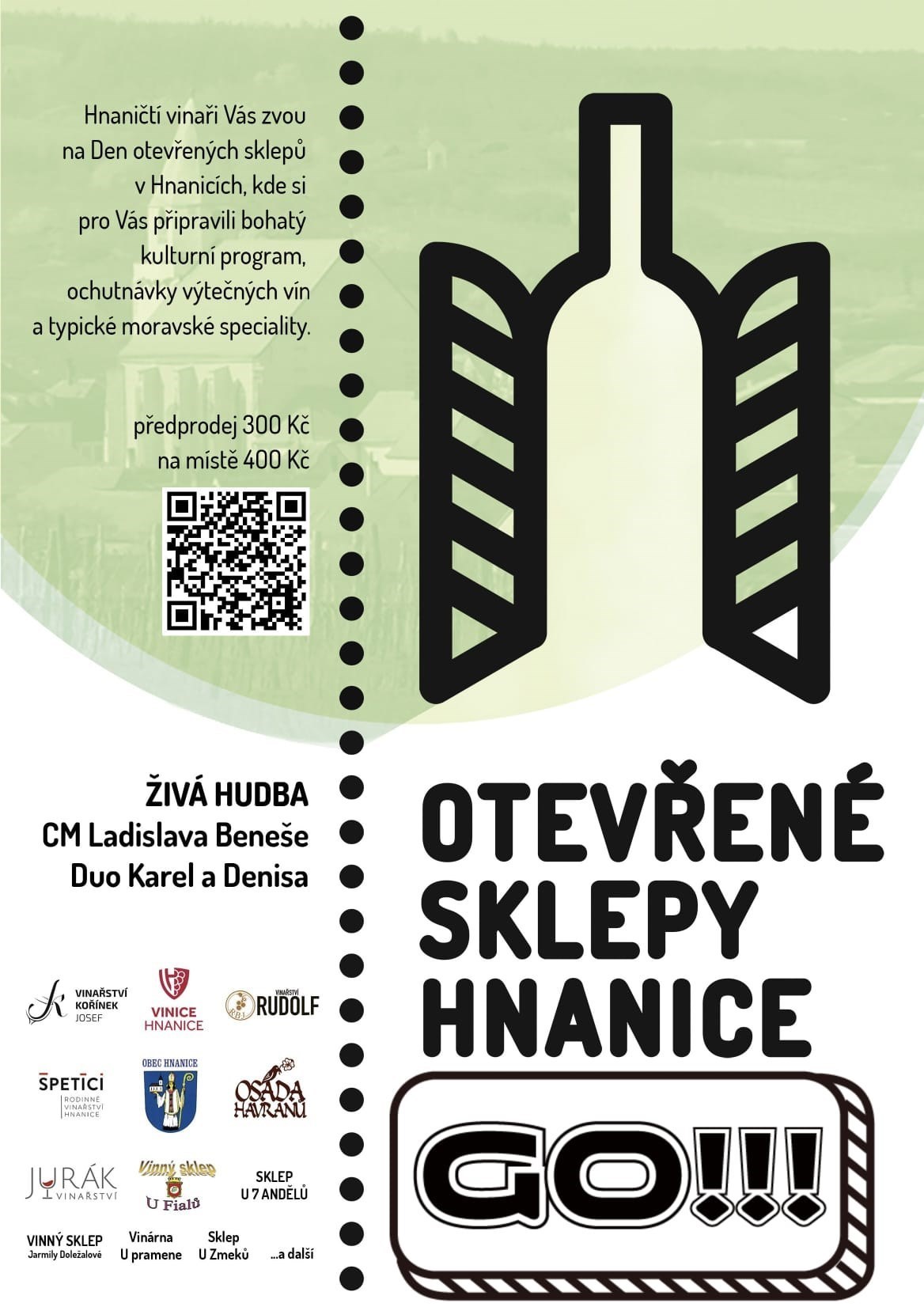 Bude znovu posílené autobusové s pojení Znojmo - Hnanice a zpět Atmosféru doladí na náměstíčku na začátku sklepní uličky Kulturní program - 12- 15 hod CM Špalek 15 -19 hod CM Ladislava Beneše (NOTEČKA) 19 - 23 hod DUO Roman a Jarda Od 14 hodin budou sklepní uličkou zpívat Žačanští mužáci a Harmonikář Opět můžete během letošního ročníku využít aplikaci Vinařského asistenta, kterou budou moci využít návštěvníci při Dnech otevřených sklepů v Hnanicích.