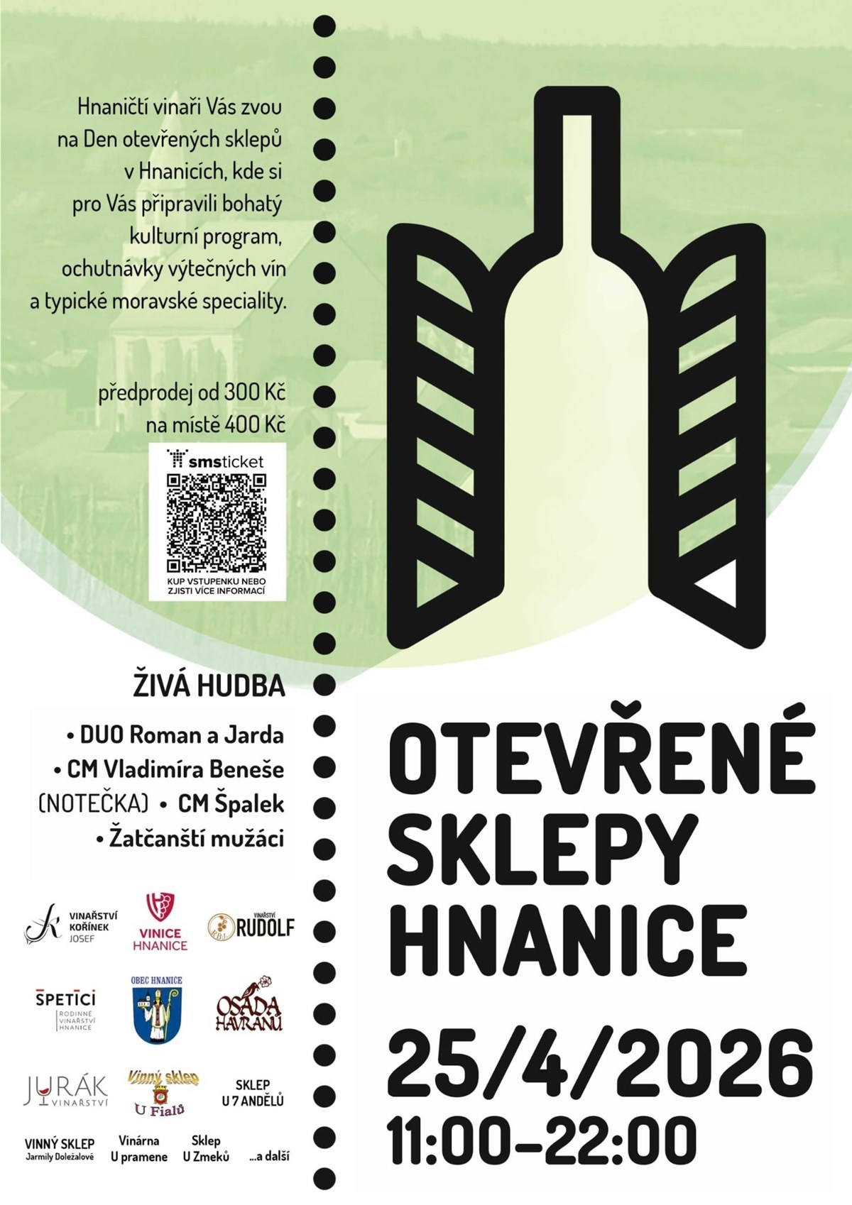 Vstupné v předprodeji je ve dvou vlnách. První vlna při zakoupení do 31.3.2026 je 300,- Kč, druhá vlna do 25.4.2026 do 0 hodin je 350,- Kč. Pak na místě 400,- Kč a obsahuje skleničku, dva poukazy na nákup lahví vína(2x 100,- Kč), mapku otevřených sklepů, pásku.