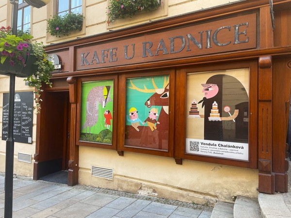 Obroková ulice hostí novou výstavu. Vitríny bývalé úřední desky zdobí ilustrace k pohádkovému příběhu Budulínek od Venduly Chalánkové.