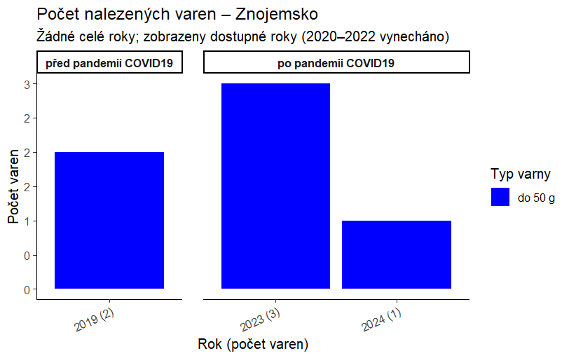 V období před pandemií COVID-19 (2017–2019) byly na Znojemsku odhaleny 2 varny. Během let 2020–2022 nejsou v oficiálních statistikách varen a pěstíren zaznamenány žádné varny (chybí kompletní data za pandemické období). Rok po covidu došlo k odhalení hned 3 varen. Nicméně za poslední dva roky byla zaznamenaná jediná varna. Takový trend může naznačovat, že produkce v regionu v posledních letech značně klesla a již se dále nešíří vědomosti potřebné k výrobě pervitinu poté, co původní komunity a jednotlivci byli přistiženi policií.